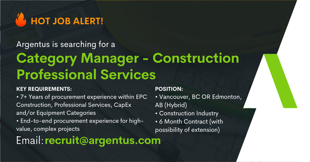 Argentus is working with a brand new client in the Construction industry on an impactful end-to-end procurement role! This company has a proud history in their industry, and an excellent centre-led procurement model. Today, they have tapped Argentus to assist them with a search for a Category Manager for their critical Construction Professional Services category!