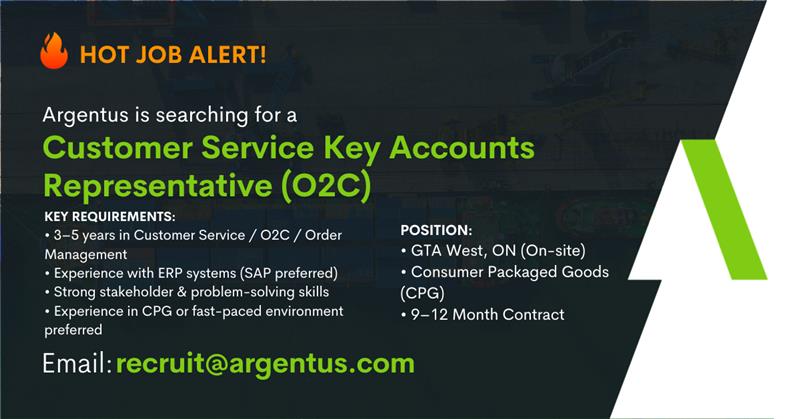 Argentus is excited to be working with a leading organization in the Consumer Packaged Goods (CPG) space on a search for a Customer Service Key Accounts Representative (O2C)! This organization is a well-established player in the market, known for its strong operational footprint and collaborative, cross-functional environment. They’ve partnered with Argentus to support a key hire within their Order-to-Cash function on a contract basis.